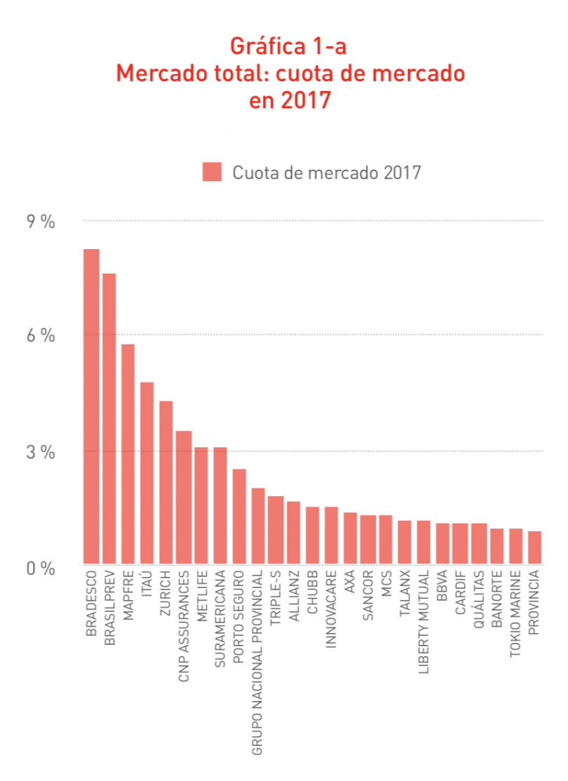 A Bradesco Seguros lidera a classificação dos grupos de seguros que operam na América Latina em 2017, com uma participação de 8,2%, seguido por Brasilprev (7,6%) e Mapfre (5,8%). Em relação a 2016, a Brasilprev perdeu 1,2 ponto percentual de parte pela queda na receita de prêmios, enquanto a quota de mercado Bradesco e Mapfre ganhou de 0,5 e 0,2 pontos percentuais, respectivamente.