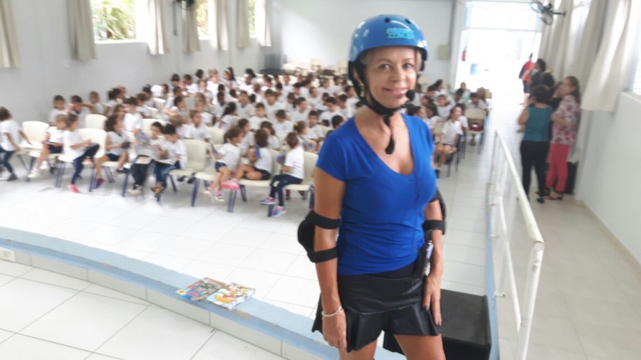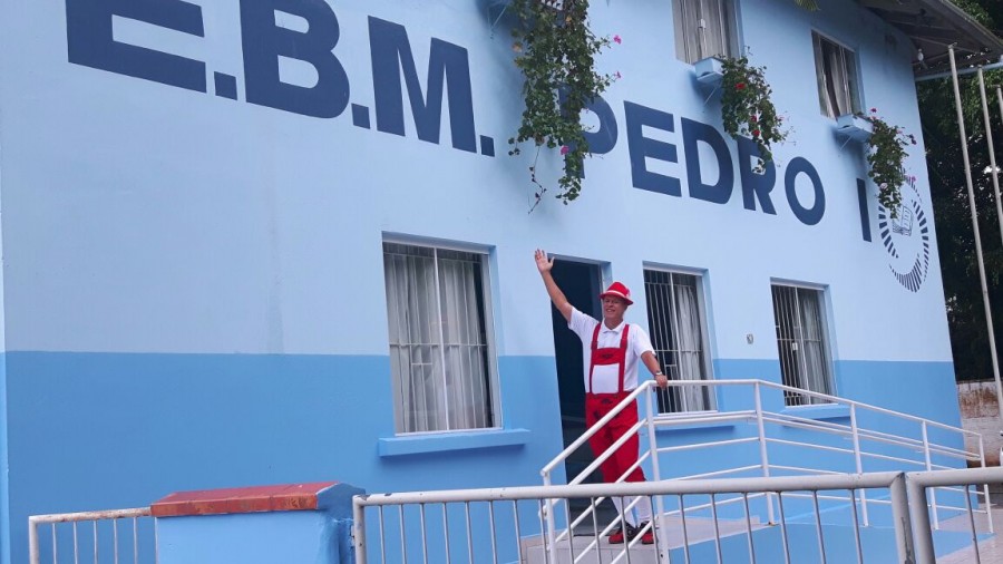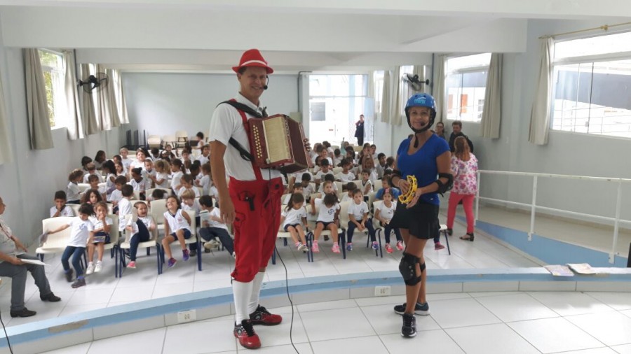 Levando alegria, informações sobre o seguro e dicas de segurança no trânsito, Rudi e Sissa, apresentaram o teatro Trânsito Feliz e o Bê-a-Bá da Prevenção na escola Pedro I.