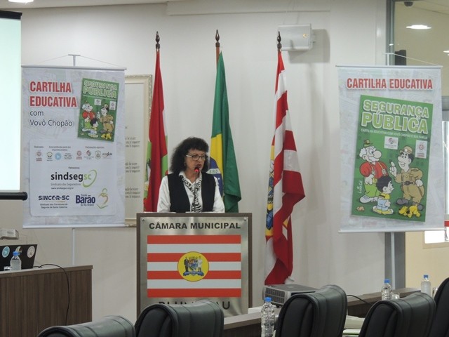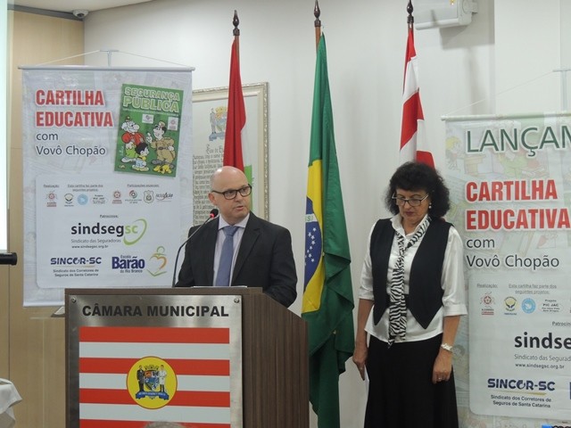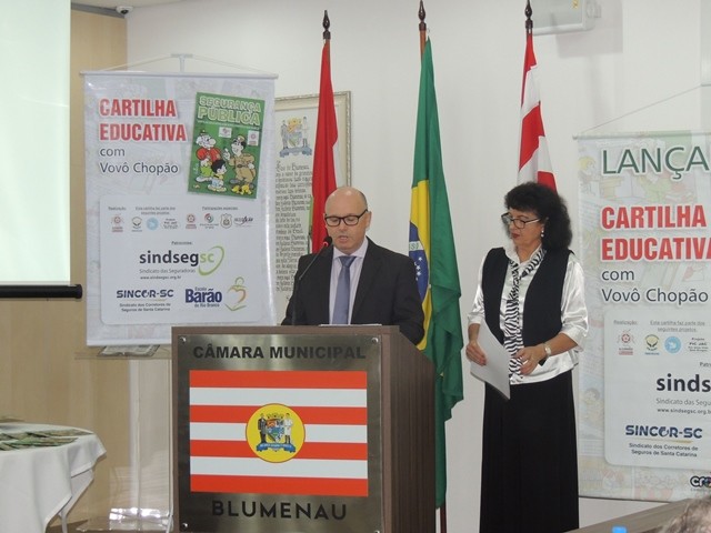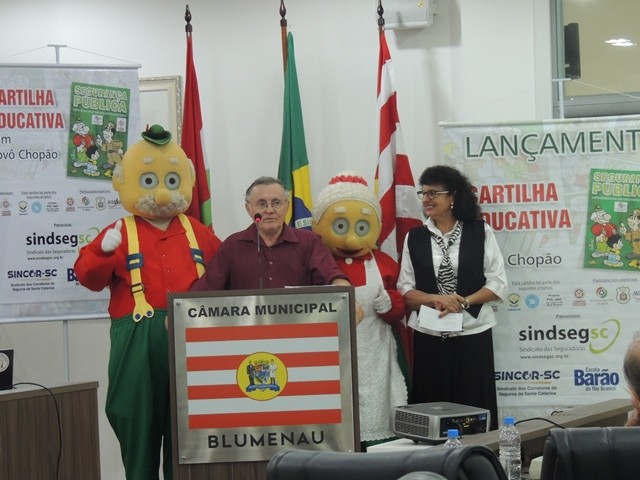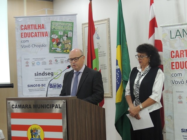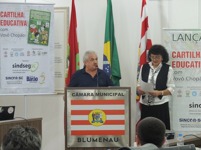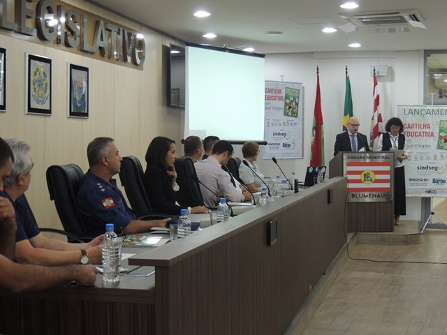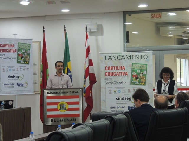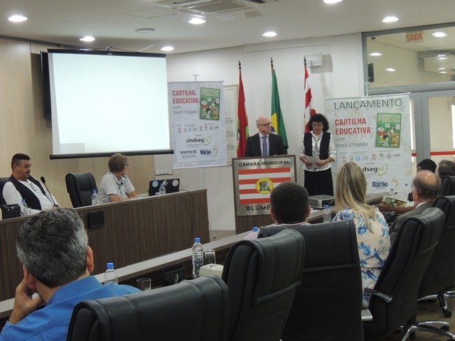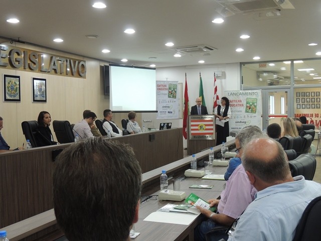 No dia 31 de março aconteceu o lançamento da Cartilha Educativa de Segurança Pública na Câmara Municipal de Vereadores de Blumenau. Na oportunidade foram apresentadas o cronograma de atividades e as entidades parceiras do projeto. Representando o SindsegSC, estavam presentes o presidente Rogerio Spezia e a gerente executiva Siméia Heleodoro. Crédito da foto: SindsegSC | Salete Sbardelatti