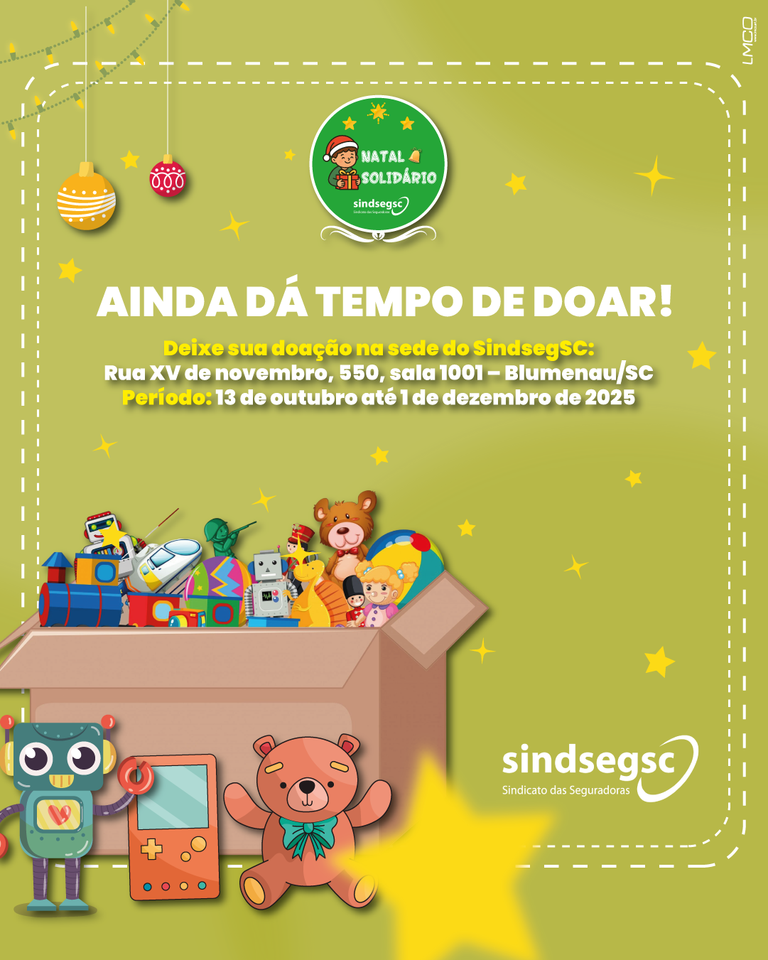 A campanha de Natal Solidário, promovida pelo Sindicato das Seguradoras de Santa Catarina – SindsegSC, segue acontecendo até dia 1º de dezembro, com o objetivo de transformar a data em um momento ainda mais especial para as crianças.