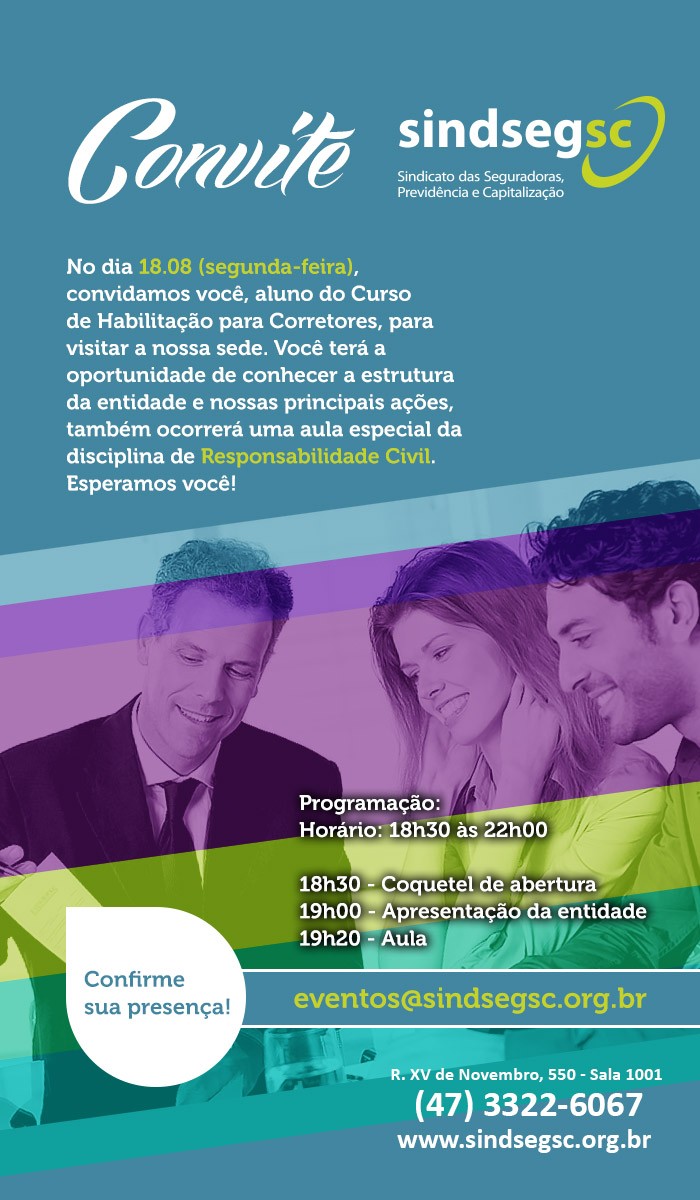 No dia 18.08 os alunos do Curso de Habilitação para Corretores de Seguros de Blumenau, visitaram a sede do SindsegSC, e conheceram as principais ações da entidade. Em seguida ocorreu a aula da disciplina de Responsabilidade Civil.