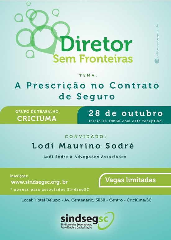 No dia 28 de outubro, terça-feira, a cidade de Criciúma recebeu o Dr. Lodi Sodré através do programa Diretor sem Fronteiras. O convidado ministrou uma aula sobre A Prescrição no contrato de Seguro.