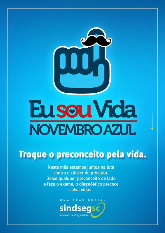 O SindsegSC criou a campanha Eu Sou Vida Novembro Azul devido a necessidade de falar sobre a saúde do homem, e principalmente da prevenção do câncer de próstata. Os profissionais das seguradoras associadas também compartilham desses ideais, usando a fitinha que representa o Novembro Azul. Confira: