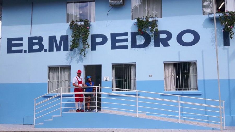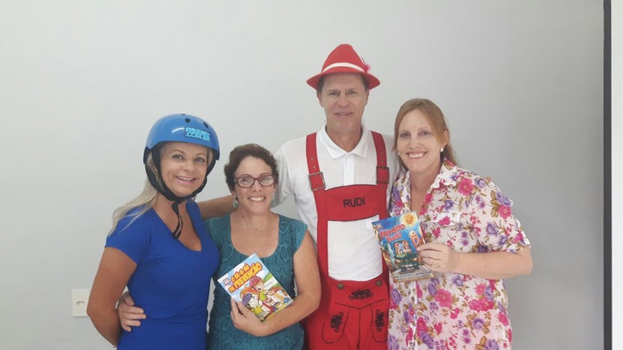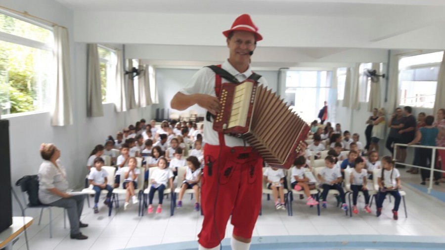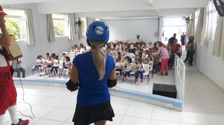 Levando alegria, informações sobre o seguro e dicas de segurança no trânsito, Rudi e Sissa, apresentaram o teatro Trânsito Feliz e o Bê-a-Bá da Prevenção na escola Pedro I.
