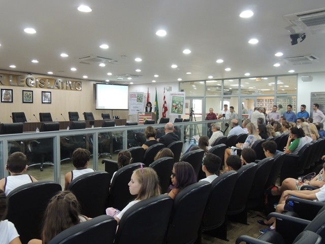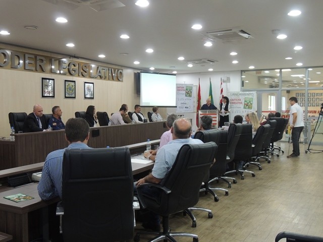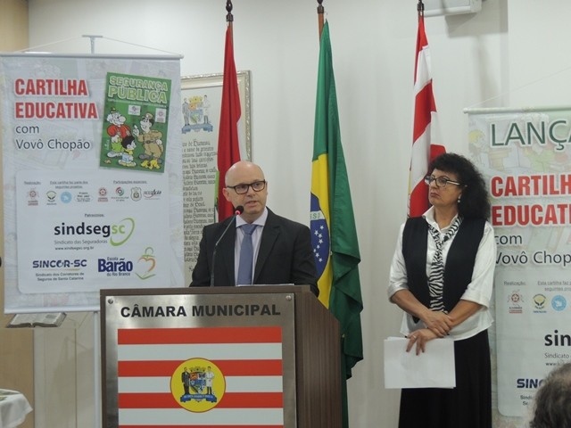No dia 31 de março aconteceu o lançamento da Cartilha Educativa de Segurança Pública na Câmara Municipal de Vereadores de Blumenau. Na oportunidade foram apresentadas o cronograma de atividades e as entidades parceiras do projeto. Representando o SindsegSC, estavam presentes o presidente Rogerio Spezia e a gerente executiva Siméia Heleodoro. Crédito da foto: SindsegSC | Salete Sbardelatti