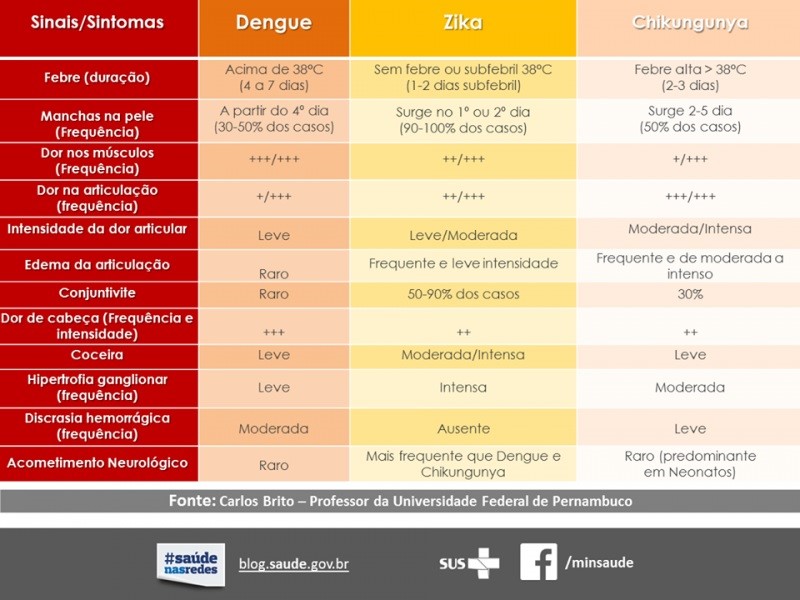 Dengue, zika e chikungunya possuem sintomas parecidos, mas algumas caraterísticas podem ajudar a diferenciá-las. Não existe tratamento específico para as infecções por estes vírus.