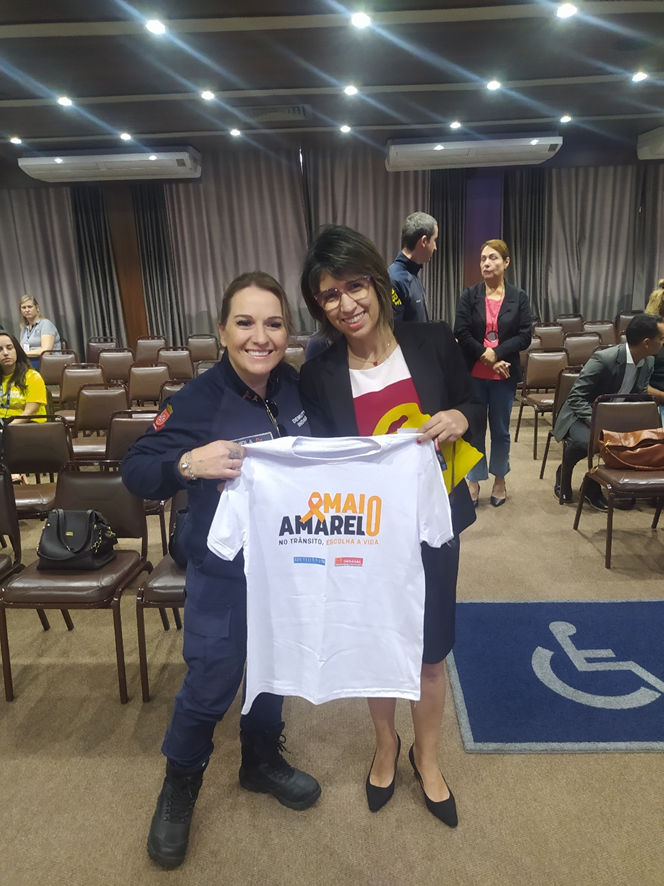 Outro momento importante para o SindsegSC foi a entrega de materiais de conscientização do Movimento Maio Amarelo de Indaial pelas mãos da Diretora do Departamento Municipal de Trânsito e Transporte de Indaial - DEMUTTIN, Sheila Daiana Maresana Almeida a Siméia Heleodoro.