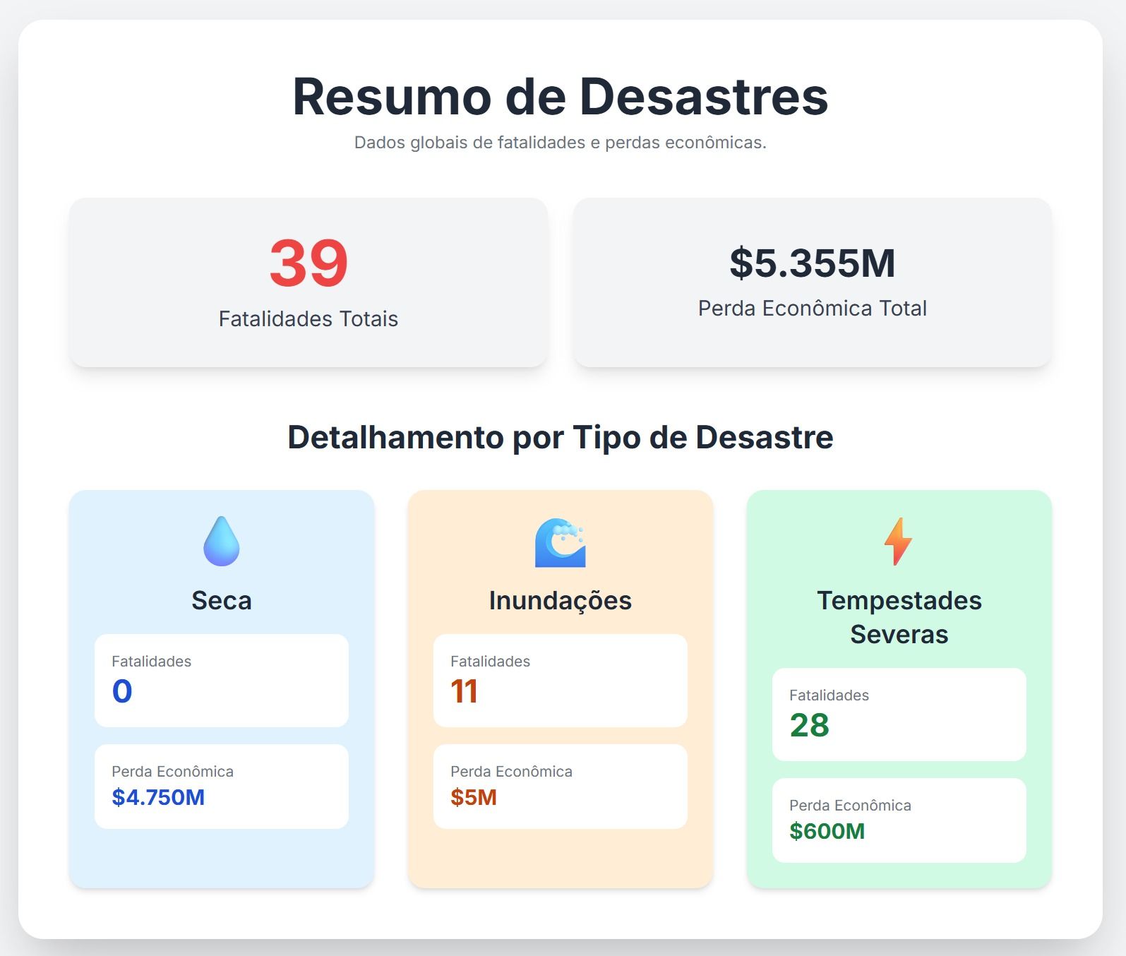 - Seca prolongada: perdas estimadas em US$ 4,75 bilhões, uma das piores estiagens já registradas no primeiro semestre.